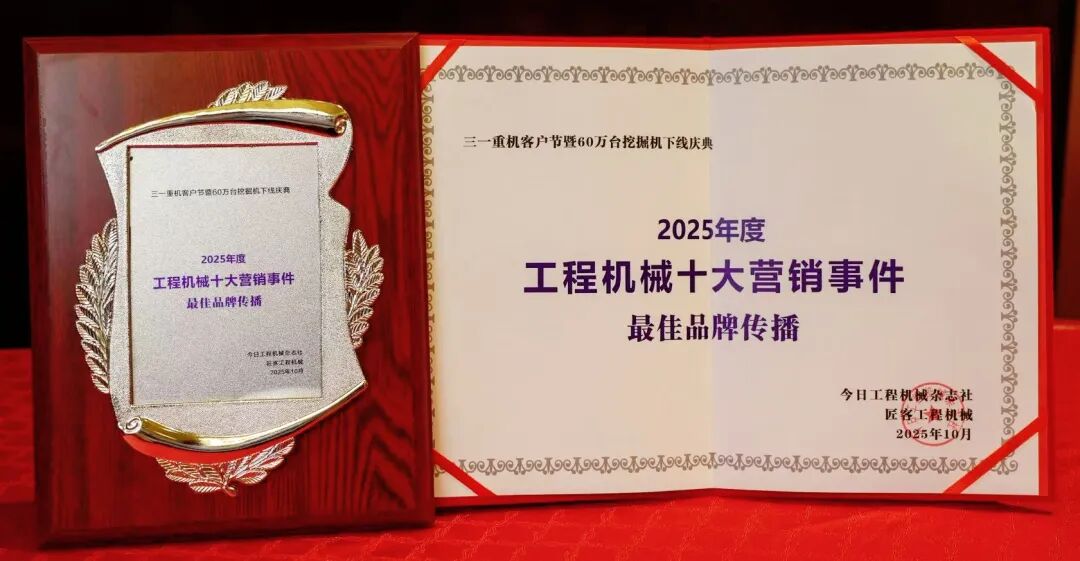 2025年10月22日,“2025年度工程機械十大營銷事件”在江蘇常州重磅發布。“三一重機客戶節暨60萬臺挖掘機下線慶典”榮登“2025年度工程機械最佳品牌傳播事件”。